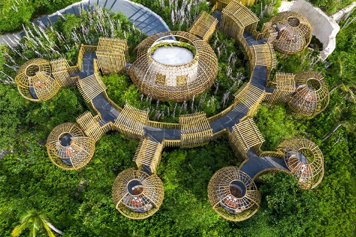 Urcați în vârful copacilor pentru a lua masa în cele șapte coșulețe din bambus ale restaurantului Terra, împreună cu tarife de lux și peisaje panoramice.